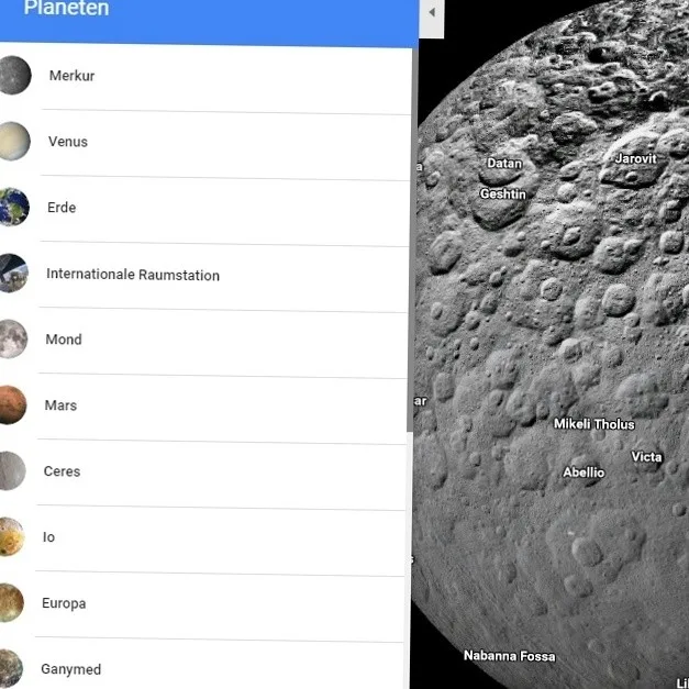 Schon seit vielen Jahren kann man in Google Maps den Erdmond und unseren Nachbarplaneten Mars erkunden. Nun wurde das Weltraum-Programm mit Google Maps Space ordentlich erweitert. Die restlichen Gesteinsplaneten Merkur und Venus sind nun dabei, der größte Asteroid Ceres und der Ex- und nun Kleinplanet Pluto auch. Mit Io, Europa und Ganymed kann man die Karten von drei der vier galileischen Monde des Jupiter mit der Maus rotieren. Die Saturnmonde Mimas, Enceladus, Dione, Rhea, Titan und Iapetus sind in all ihrer von der Cassini-Sonde fotografierten Pracht mit der Maus zu zoomen und zu klicken. Der Saturn-Mond Titan. Screenshot: Google Maps Space